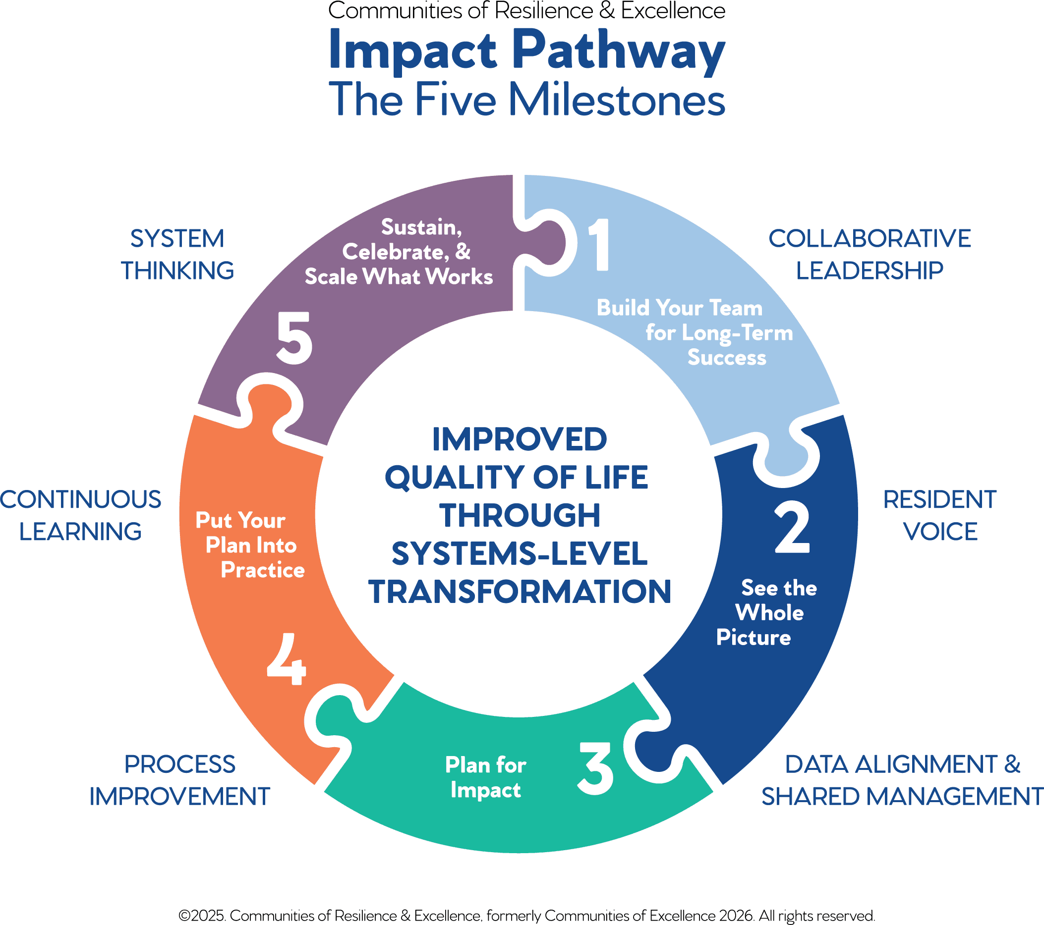 The Impact Pathway is a guided journey designed to help cross-sector community teams make measurable progress on shared priorities. Rooted in systems thinking and built on the Baldrige-inspired C.O.R.E. Guide (formerly the Communities of Excellence Framework), the pathway provides the structure, tools, and support your team needs to align people, data, strategy, and action—step by step.