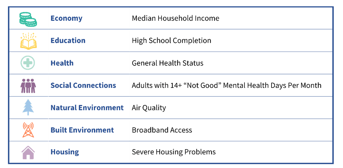 The Common Community Scorecard includes seven indicators that reflect the interconnected systems shaping every community’s quality of life.